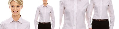 3.4 oz., 55% cotton, 45% polyester; Fine yarn count shirting; True Non-iron performance straight from the dryer; stain release finish; Active Fit; Patented pucker-free taped seams; Fused collar, cuffs, and placket; Split back seam with bias cut back yoke; straight collar; pearlized buttons; front and back princess seams for a flattering feminine fit; bust darts for a flattering feminine fit;