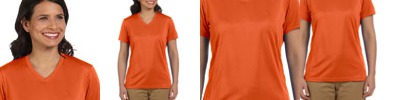 100% polyester; 40 UPF on White; 30 UPF on other colors; Wicks moisture and keeps the body dry; Sideseamed; comfortable fit; Self-fabric collar; feminine V-neck and front seams; Double needle stitching on sleeve and bottom hem; Anti-microbial treatment prevents odors from perspiration;